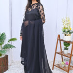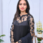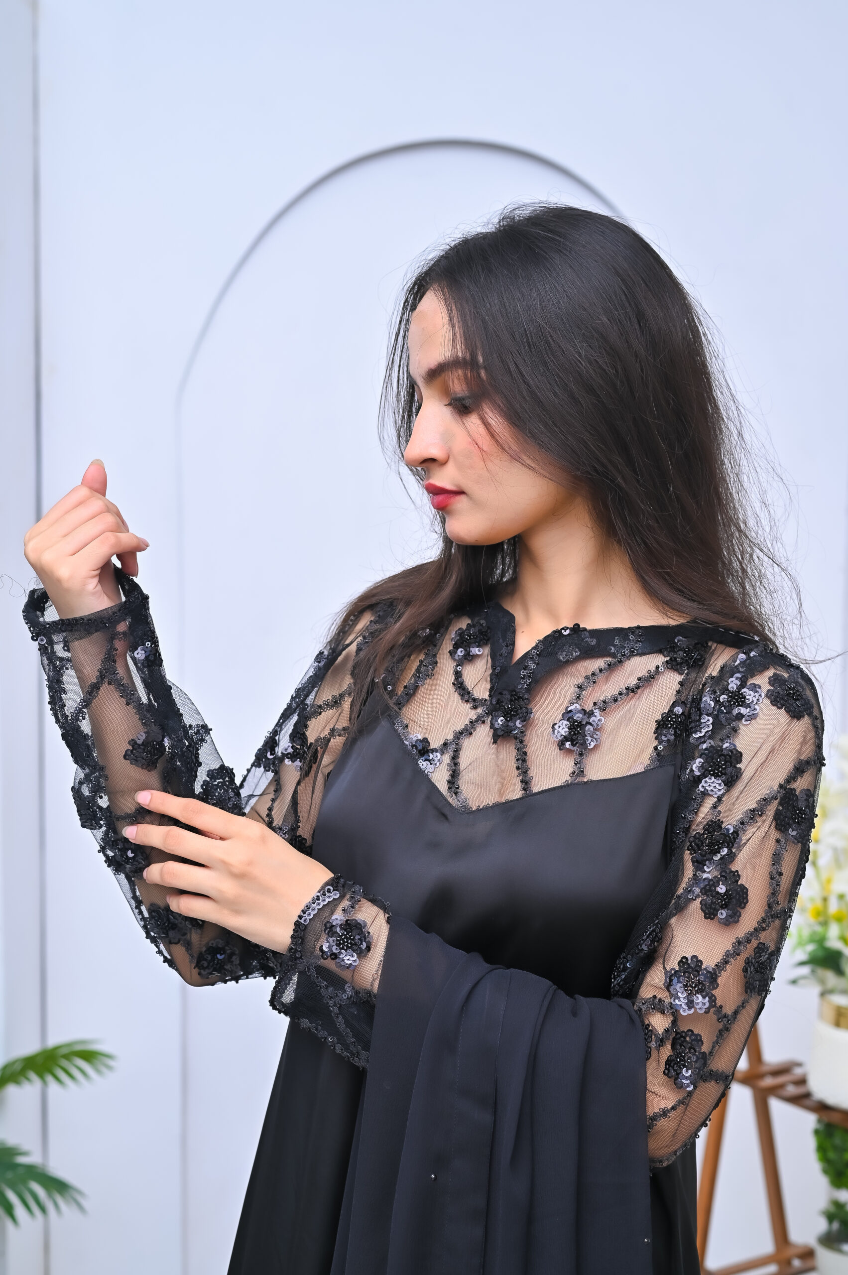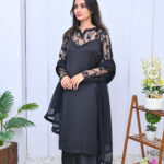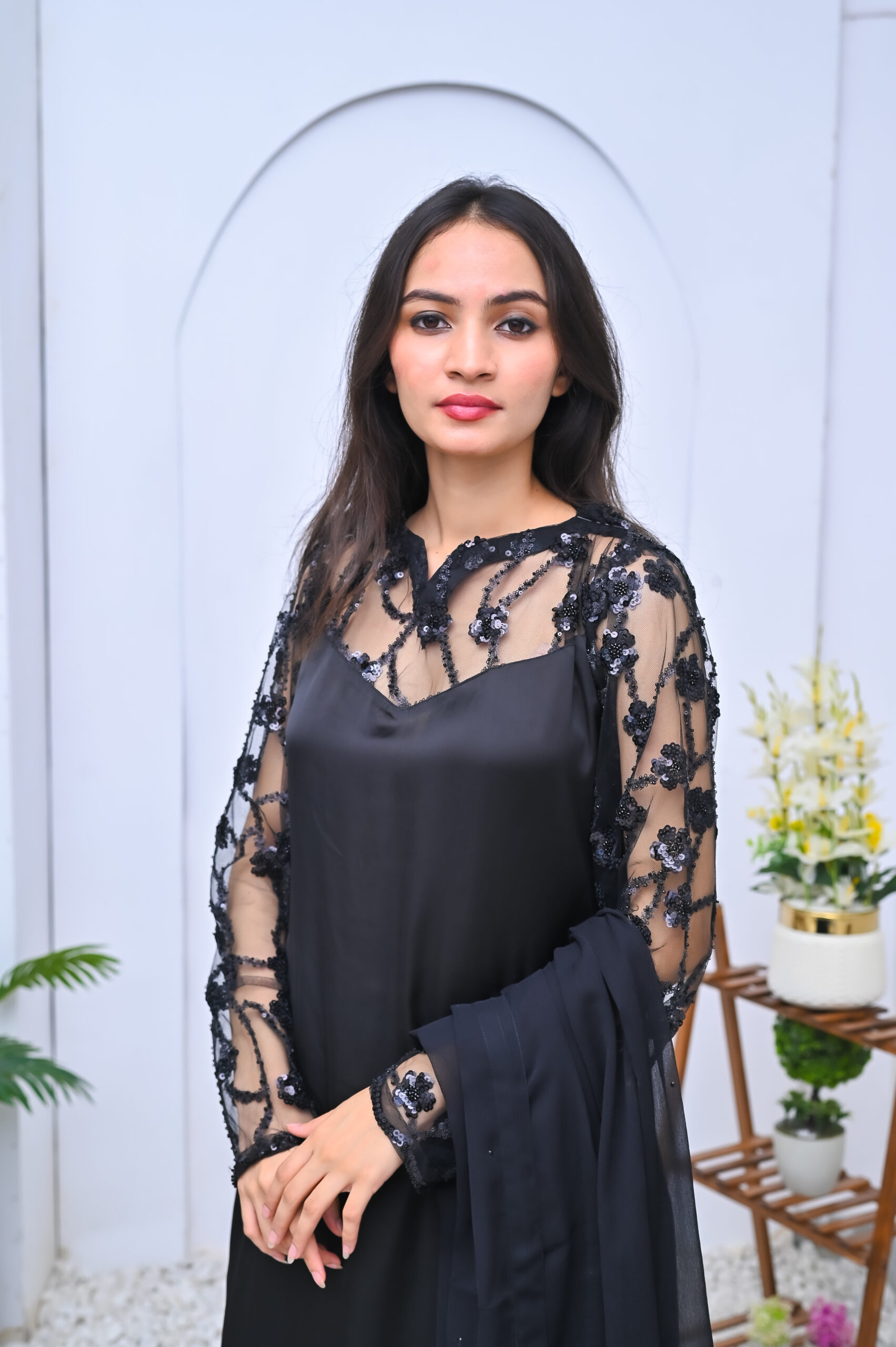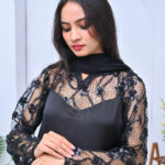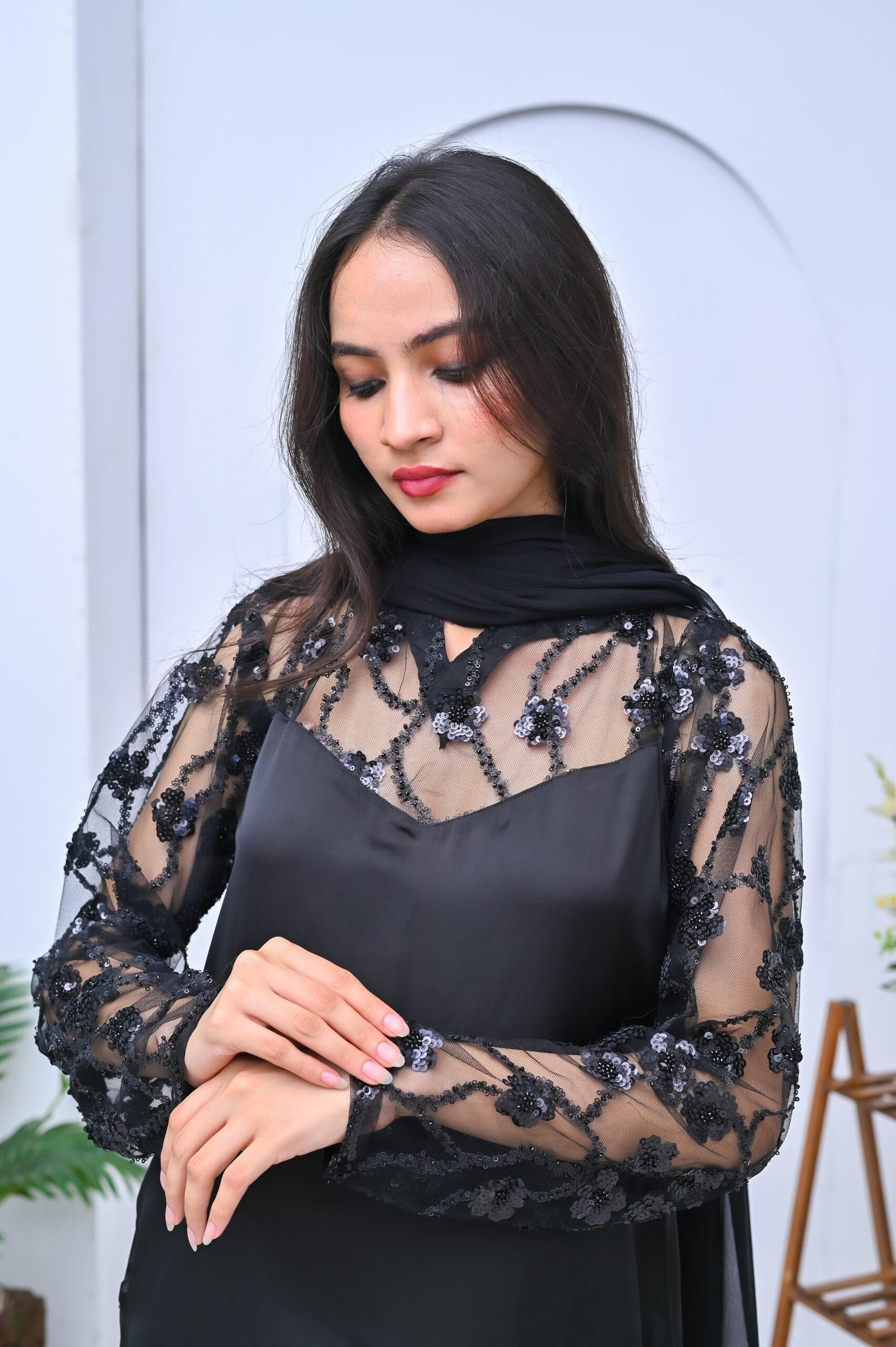 A chic and modern two-piece outfit in classic black, featuring stylish sheer shoulder detailing. Perfect for evening events or formal gatherings with a touch of elegance