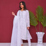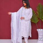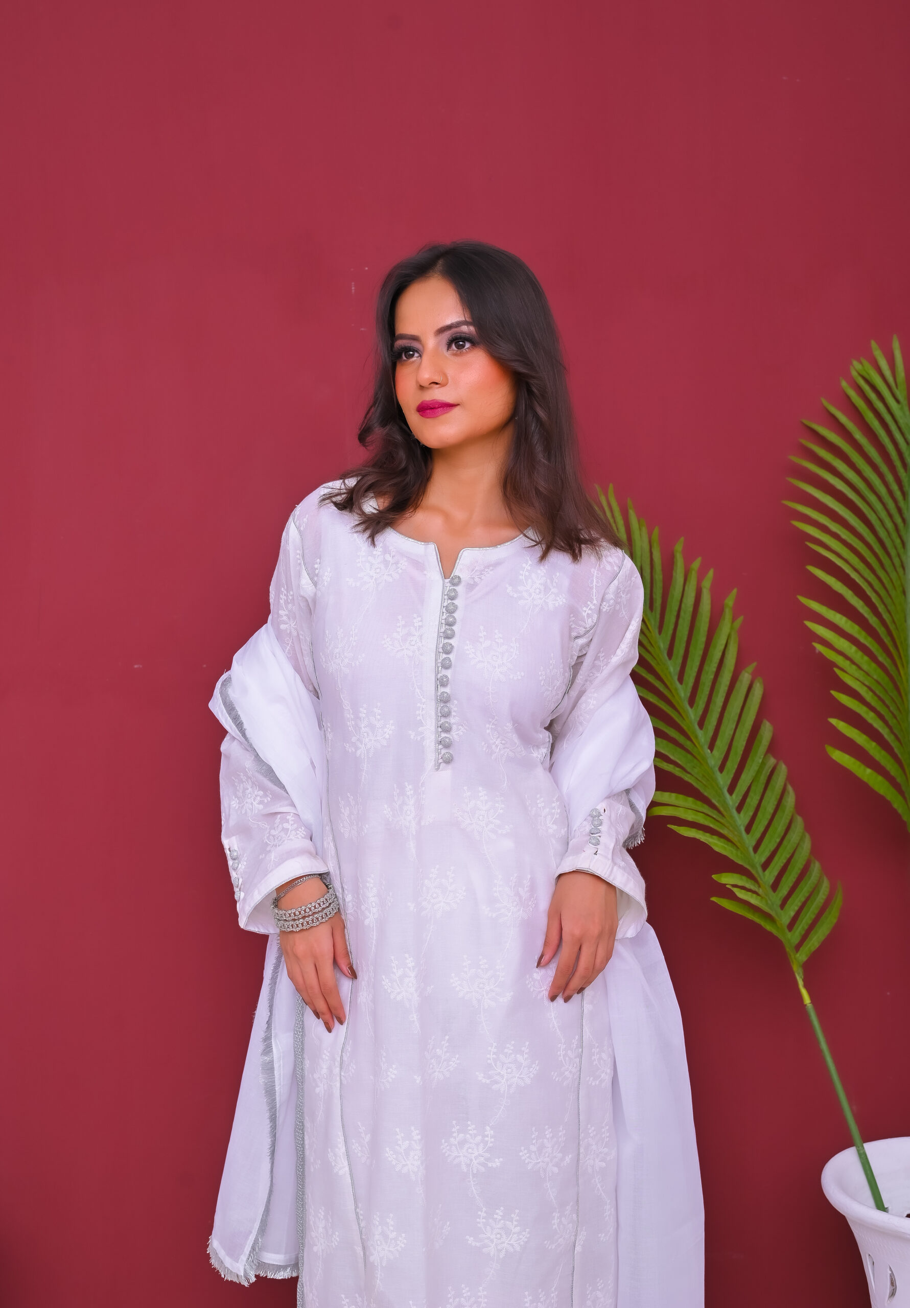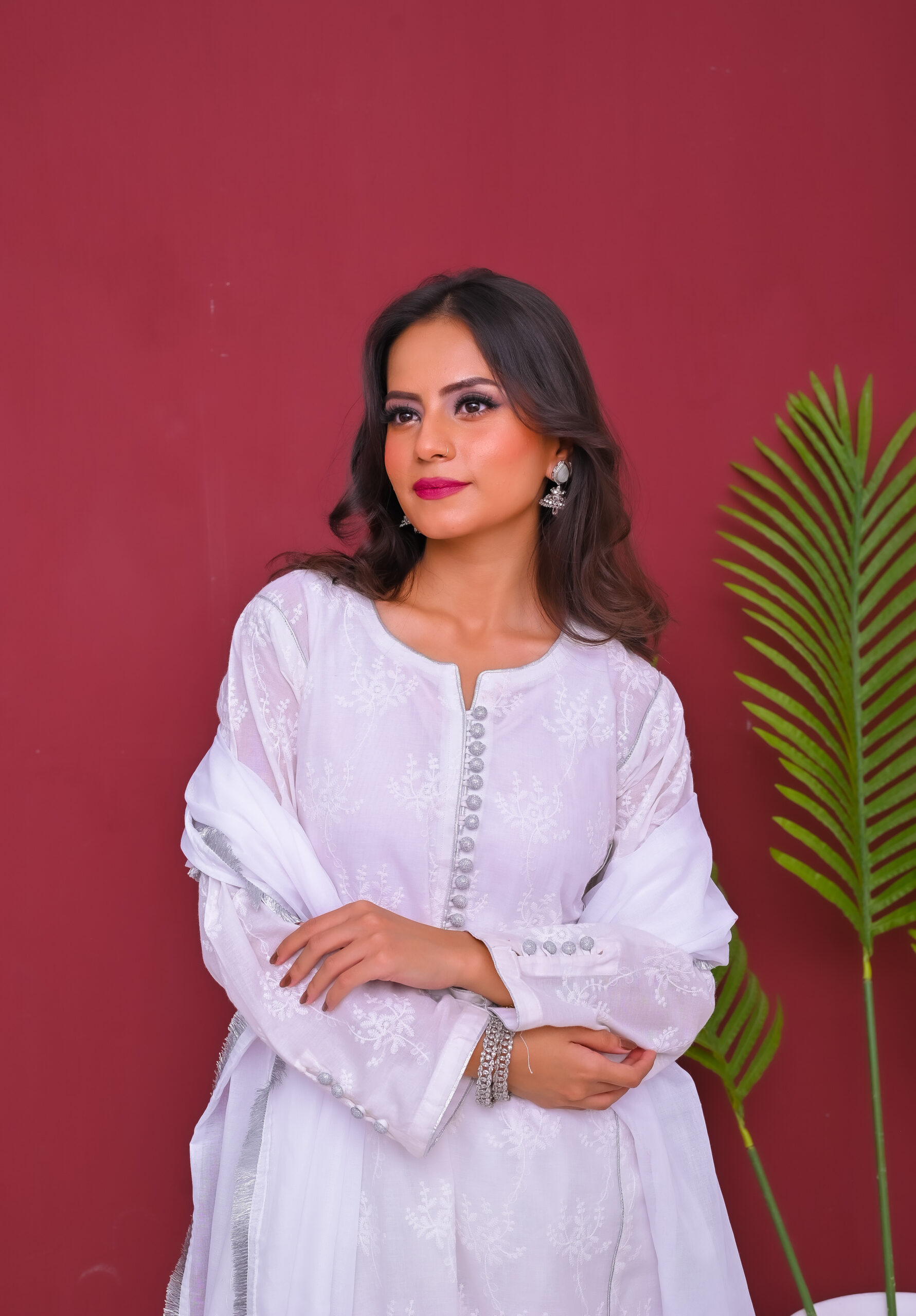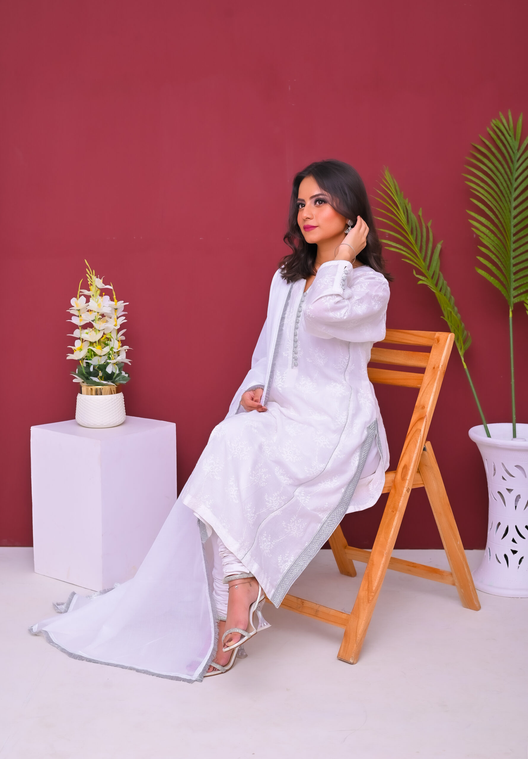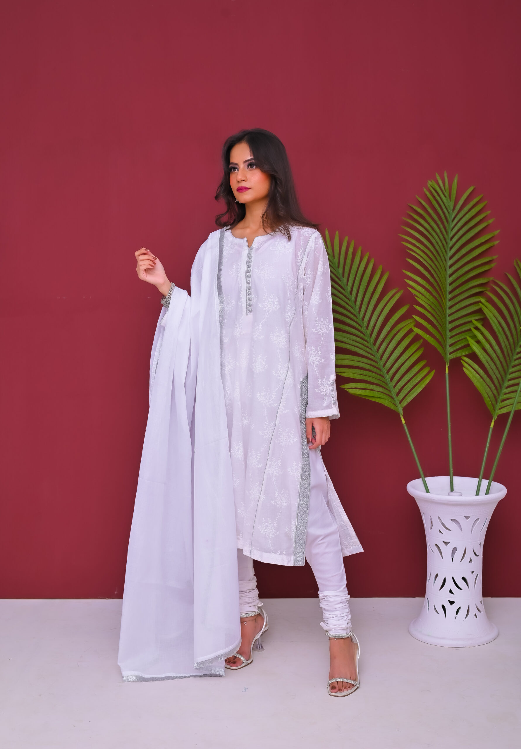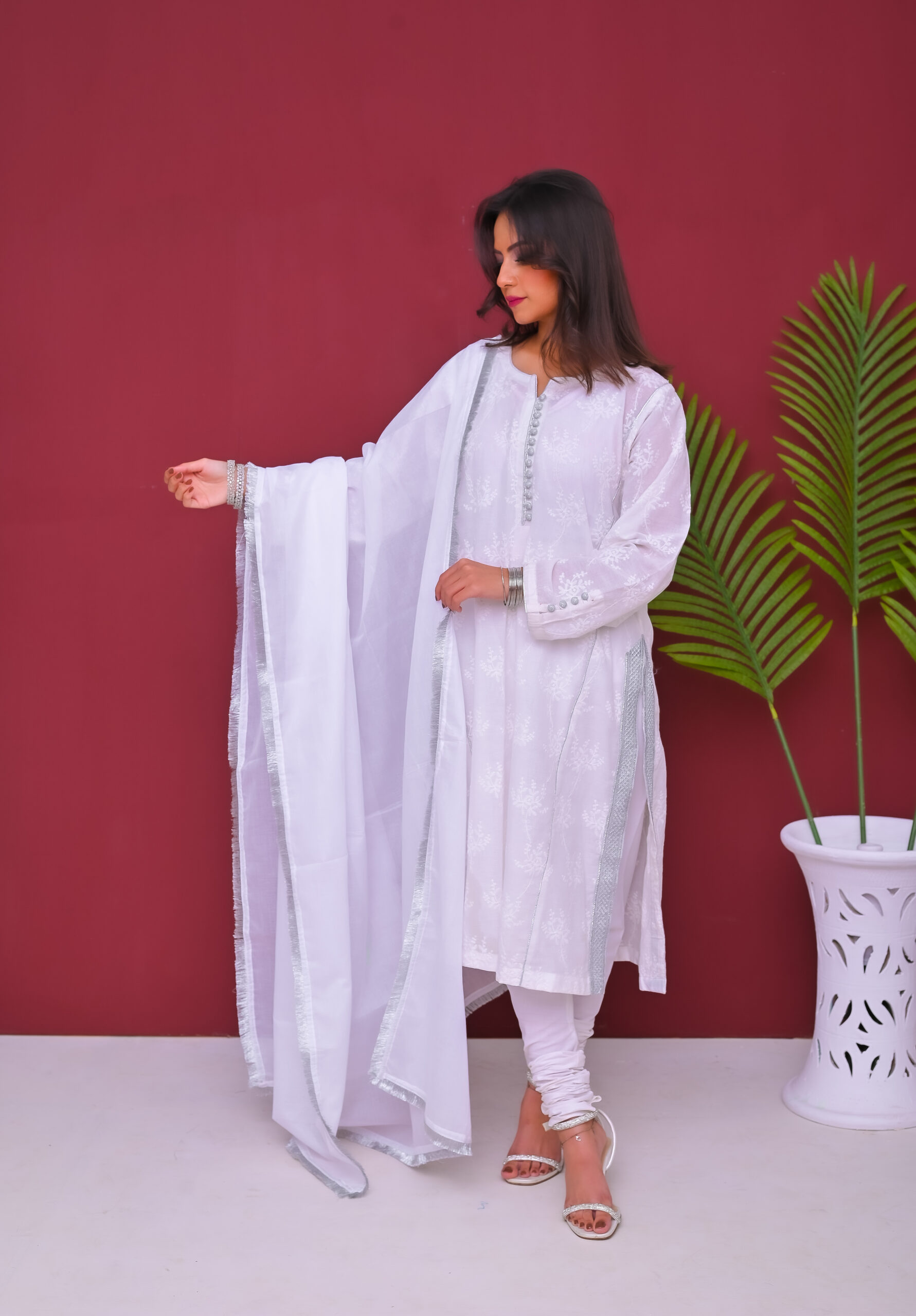 A traditional and elegant ensemble featuring a finely embroidered chikan dari kurta paired with a classic churidar pajama. Perfect for festive occasions and cultural gatherings
