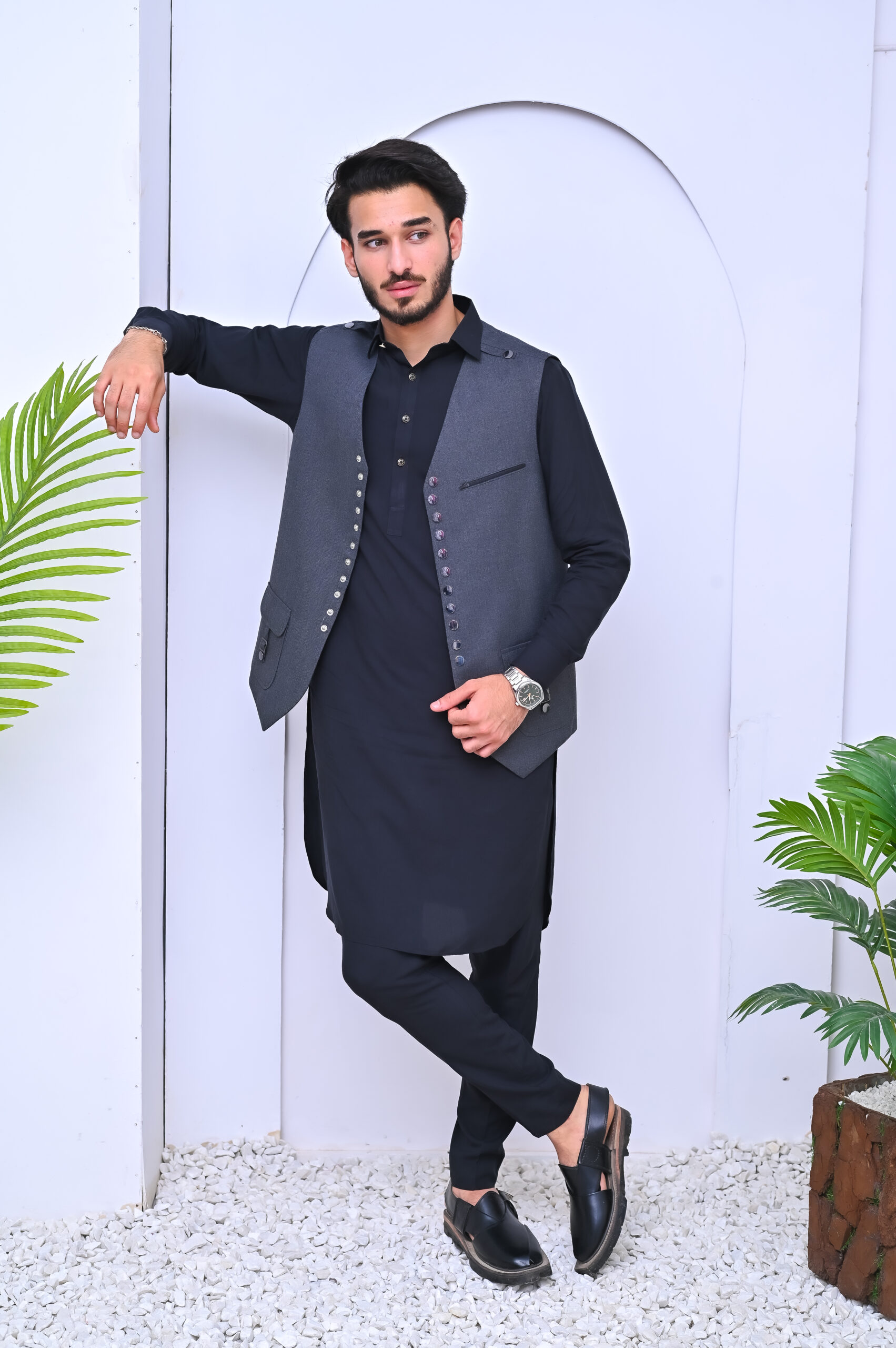 A refined waistcoat crafted from premium self-textured cotton fabric. Lightweight, comfortable, and perfect for adding a touch of elegance to any traditional or formal look.