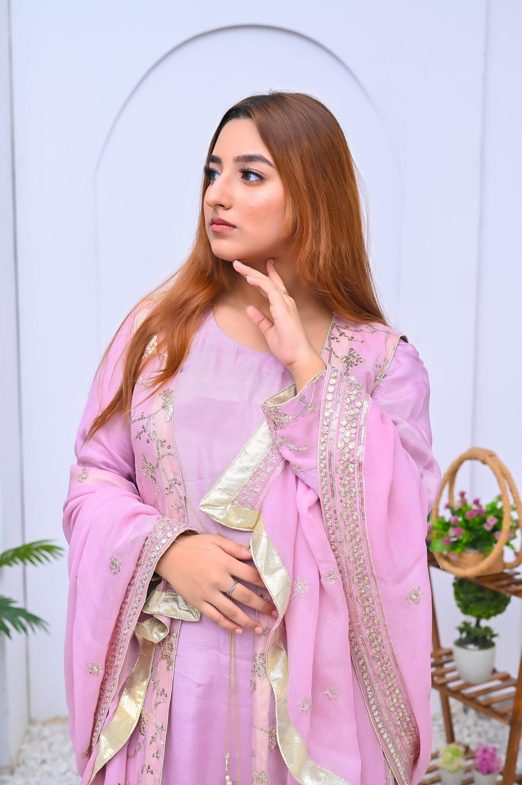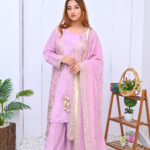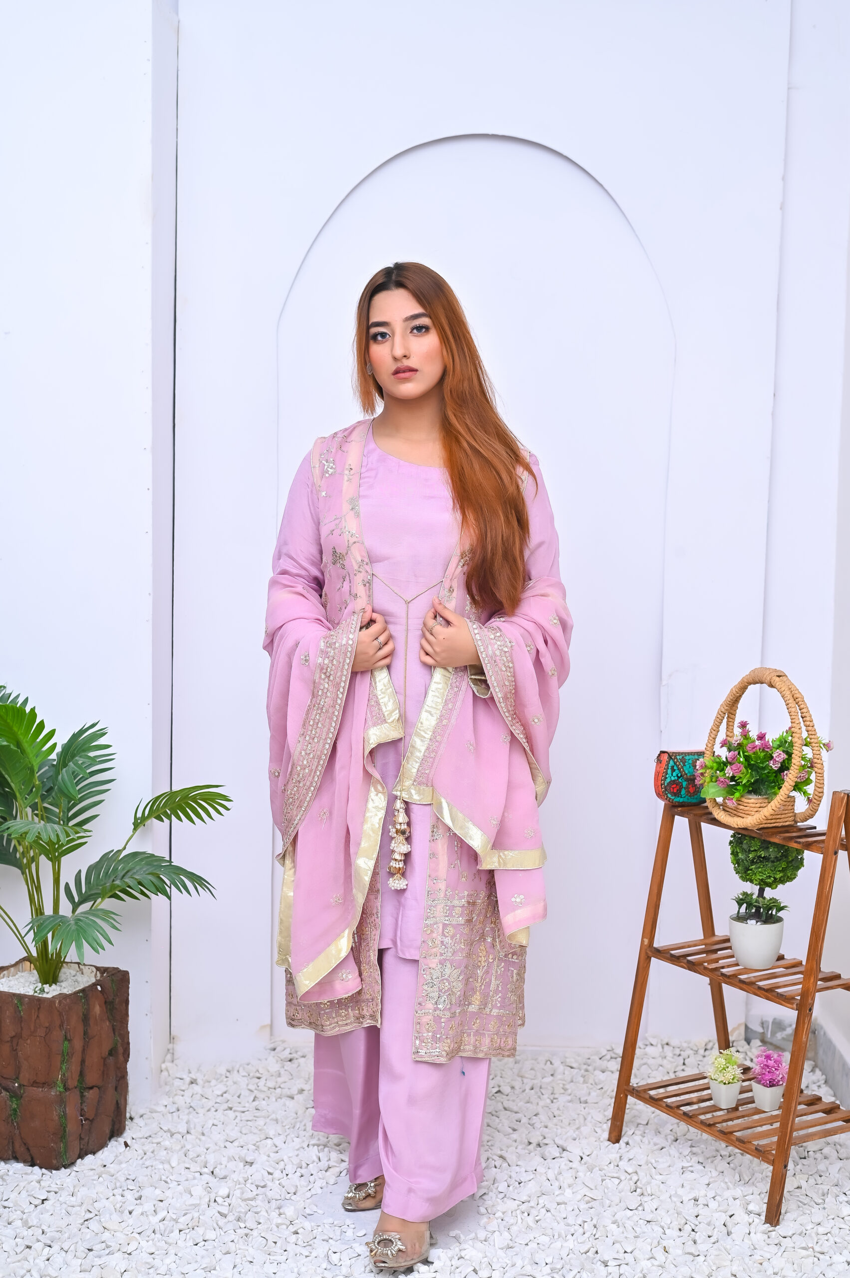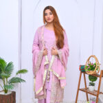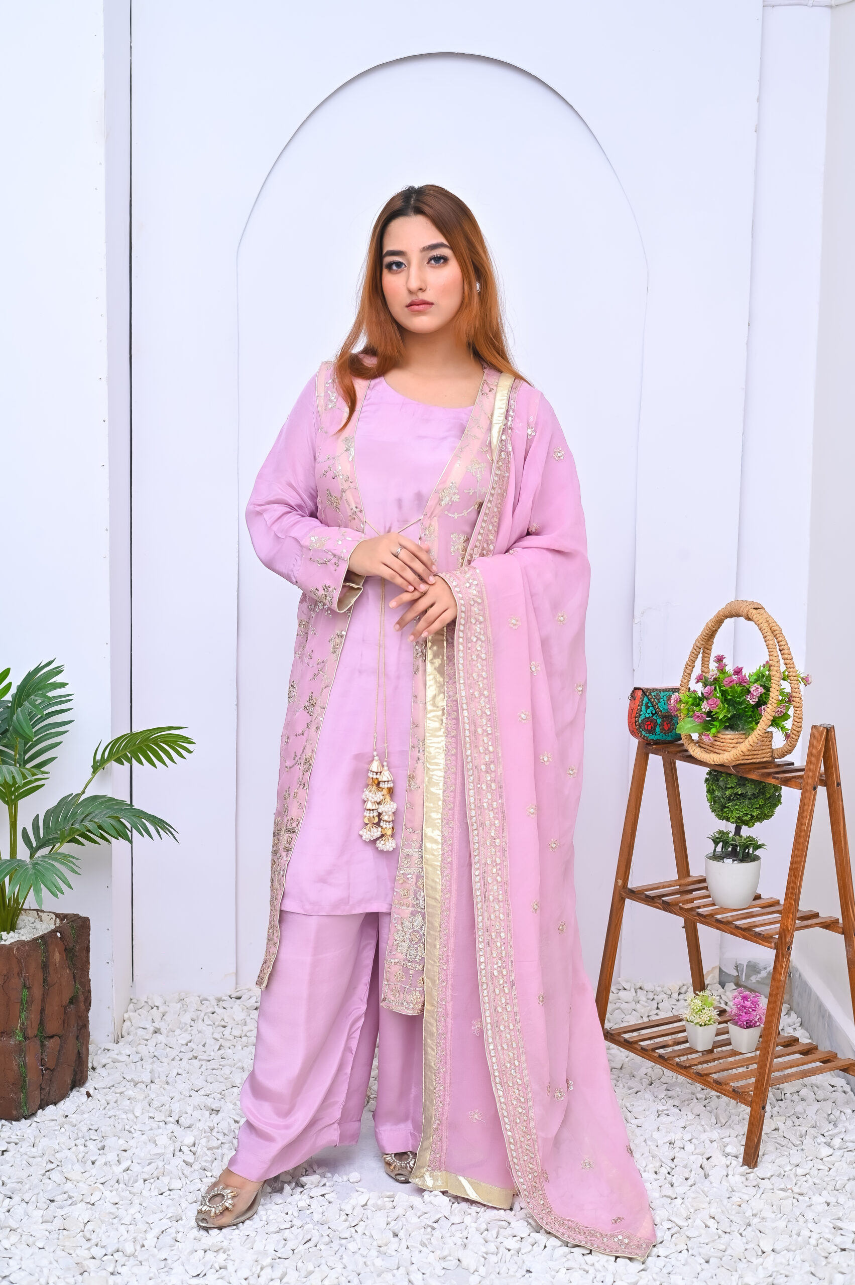 A stunning four-piece ensemble in a soft pink hue, crafted from premium fabric with elegant detailing. Perfect for festive celebrations, offering a graceful and sophisticated look