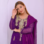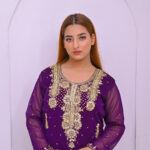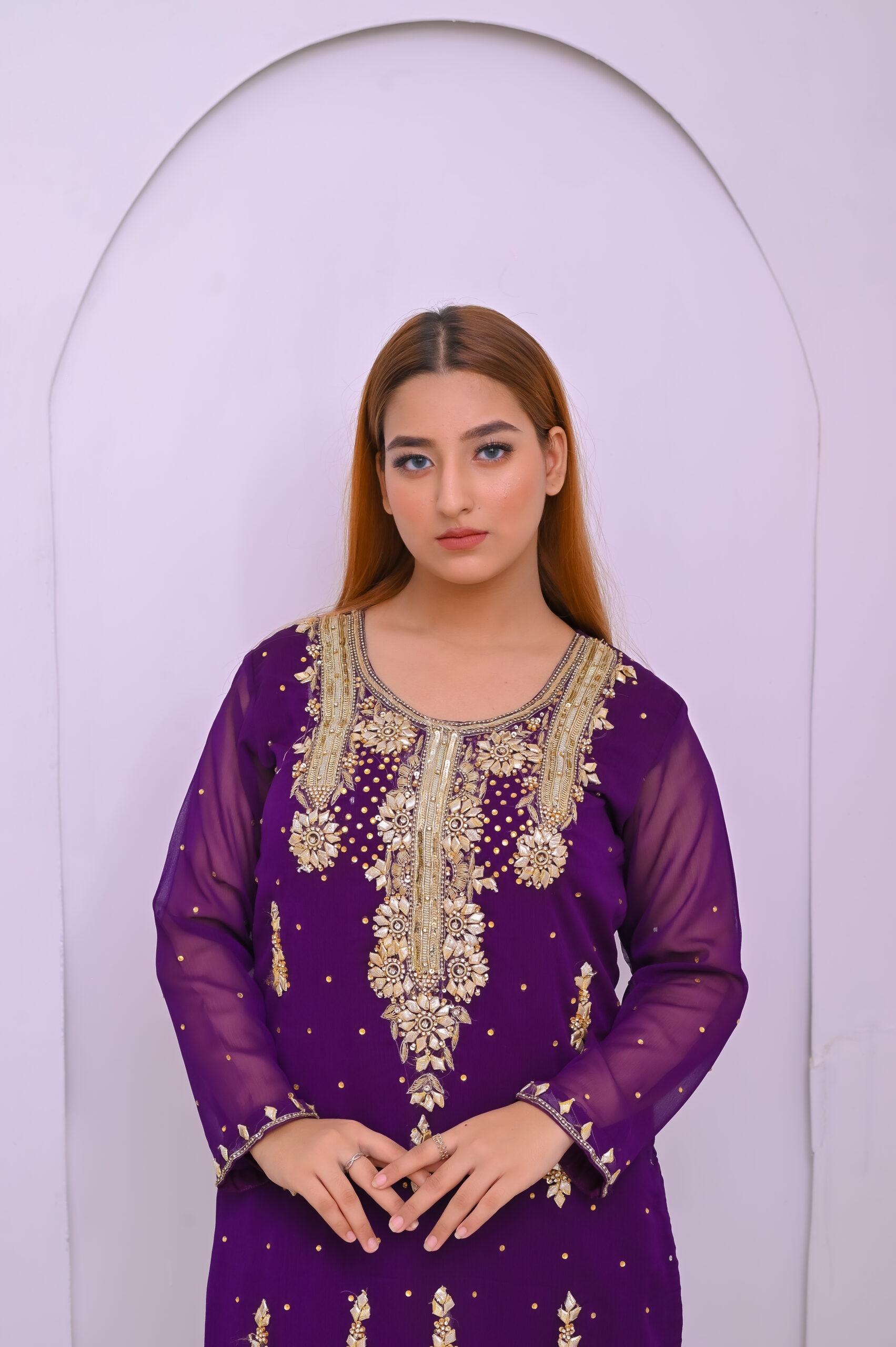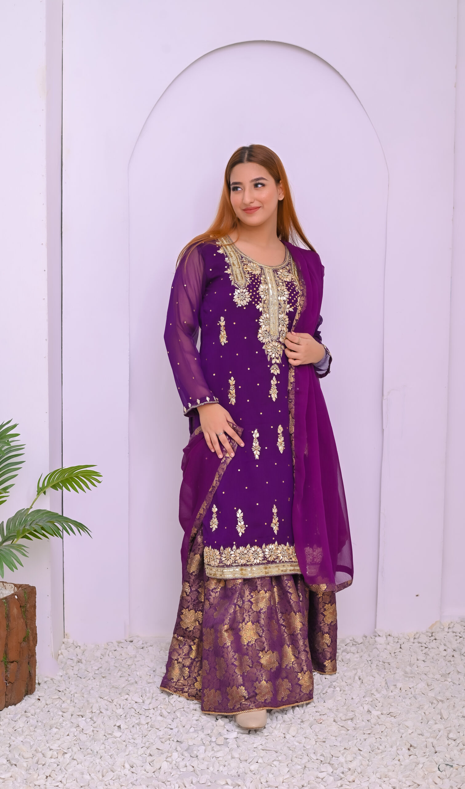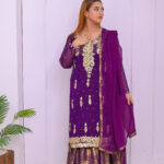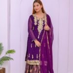A regal ensemble in rich purple, beautifully adorned with intricate zari and tila embroidery. Paired with a luxurious Banarsi farshi garara, perfect for weddings and grand festive occasions