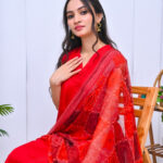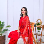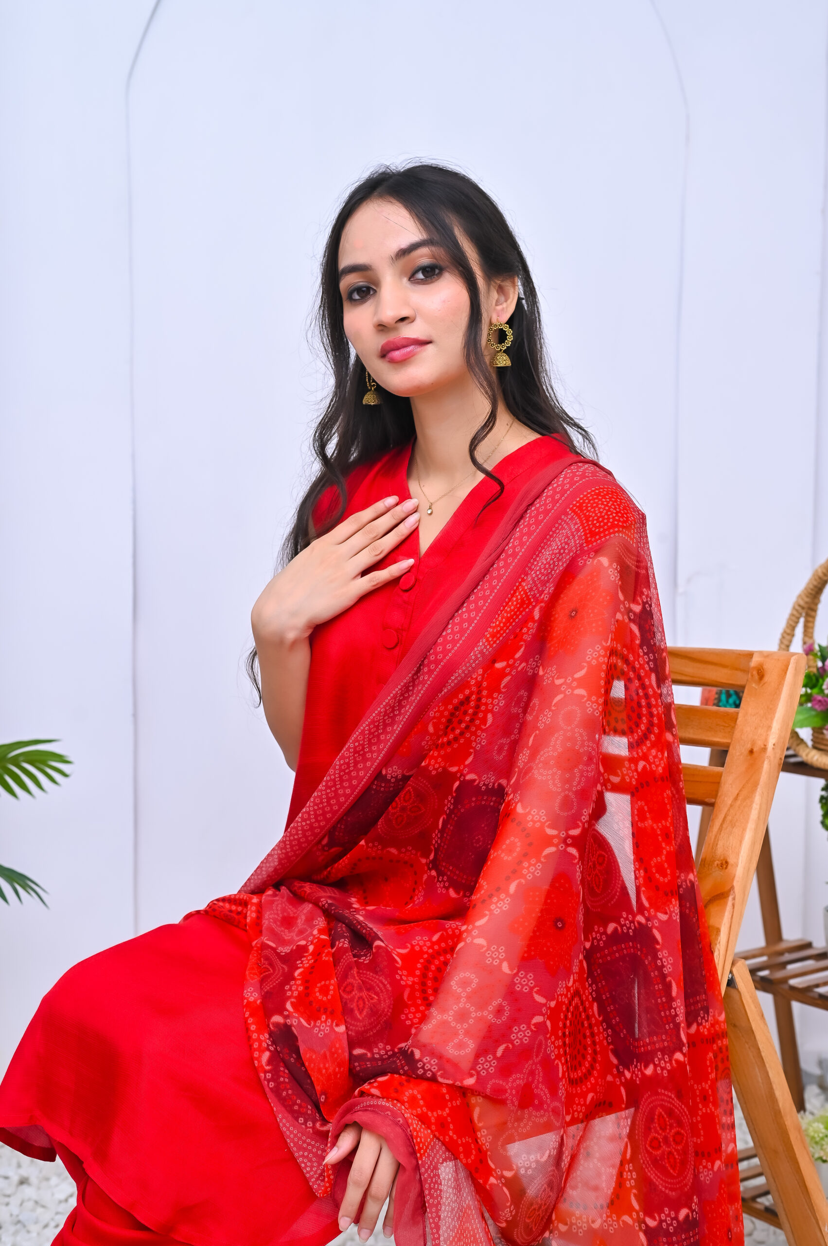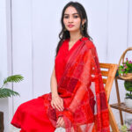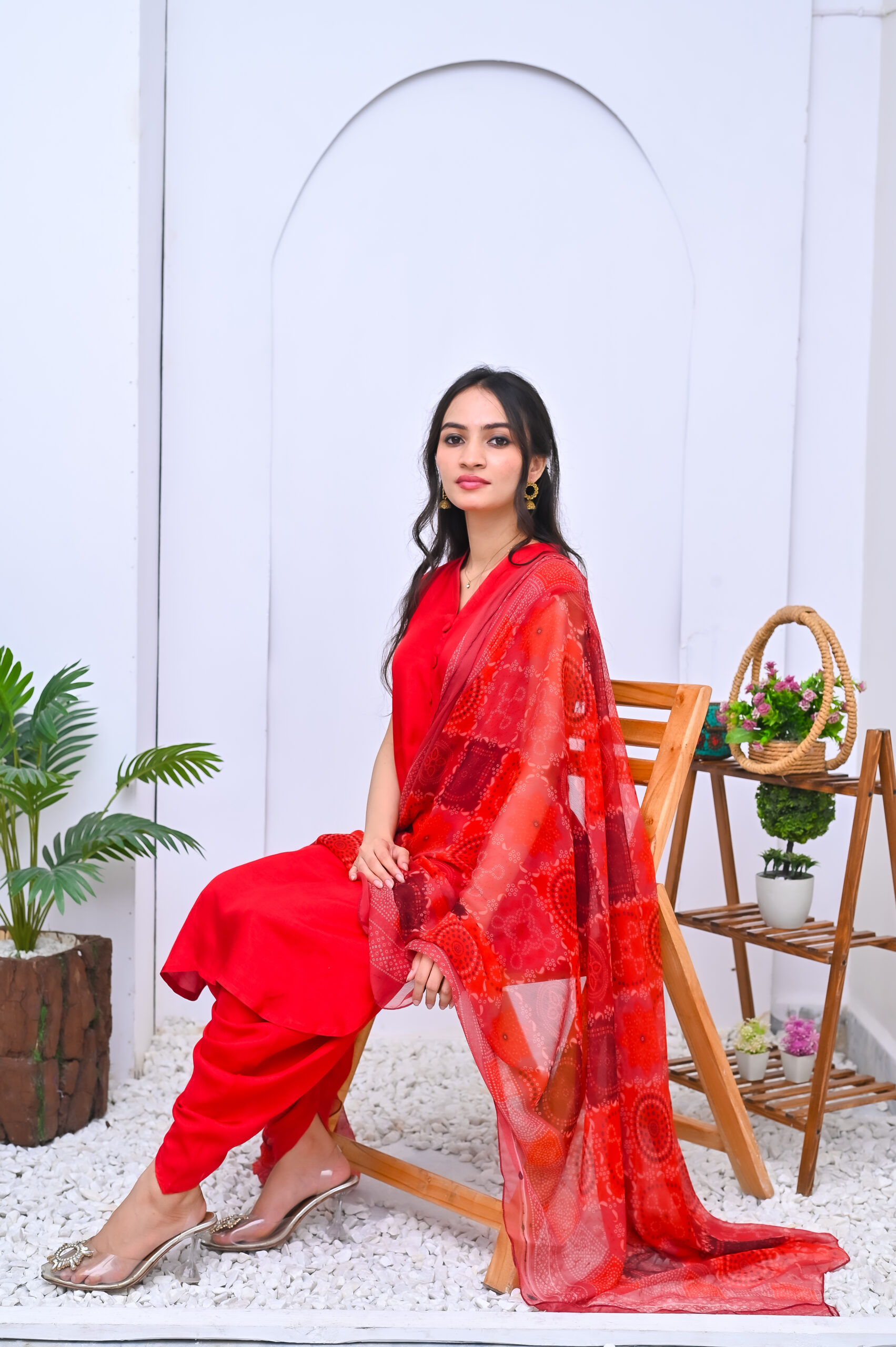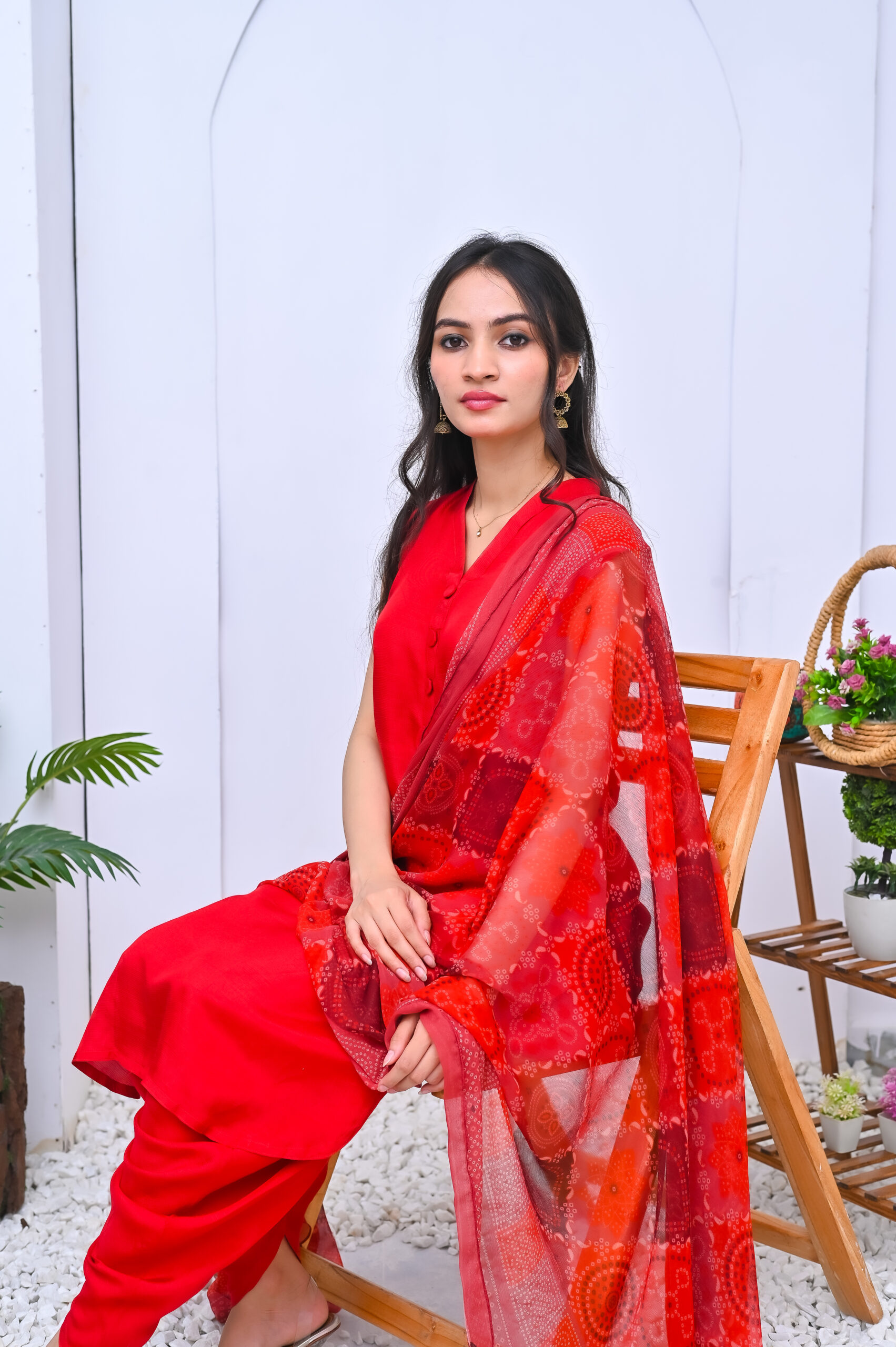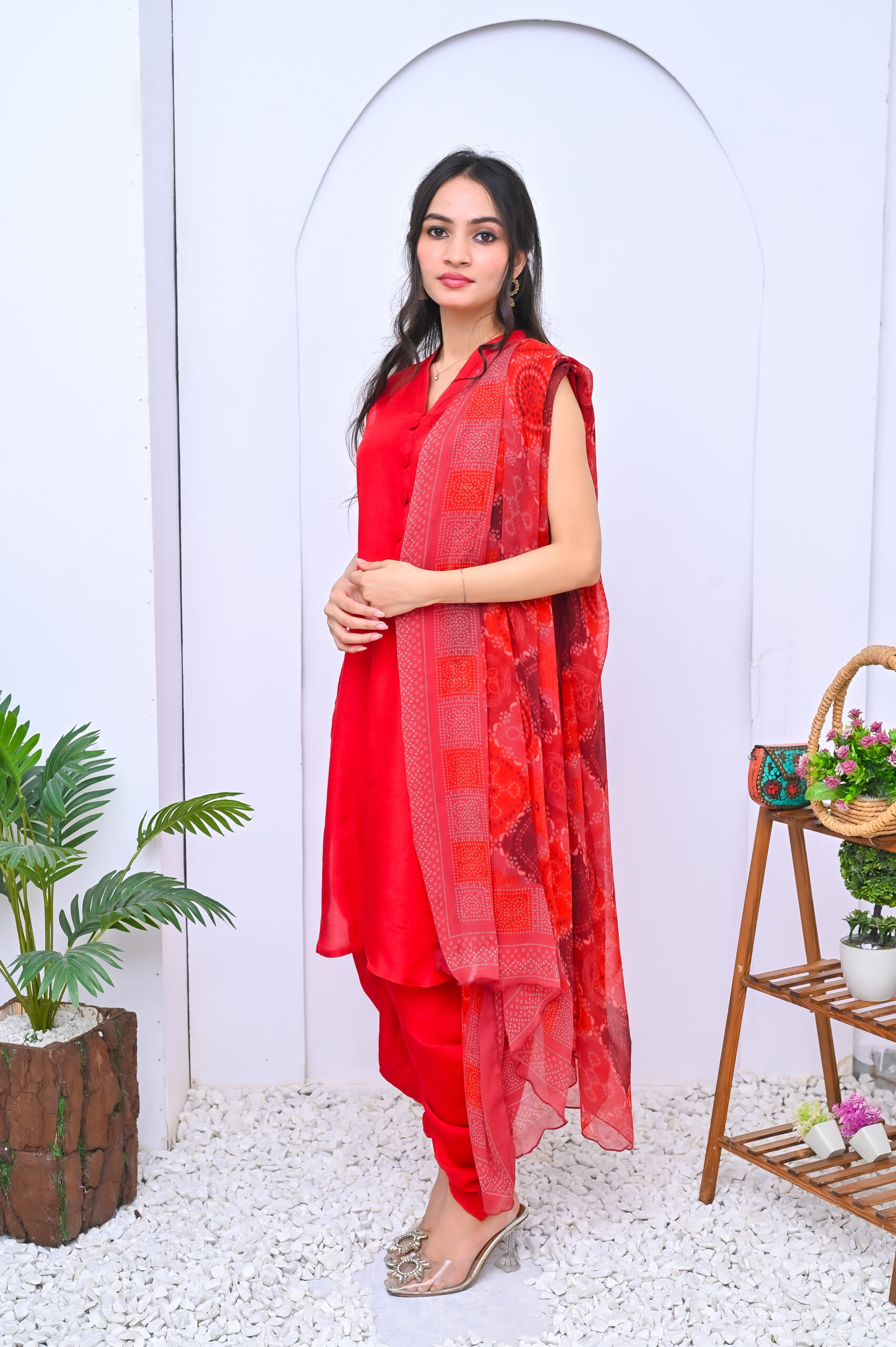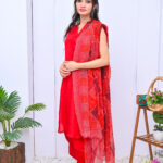 A striking three-piece outfit in a bold red shade, crafted from premium fabric. Elegant and timeless, perfect for festive occasions and formal events