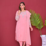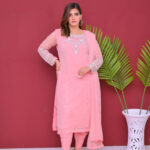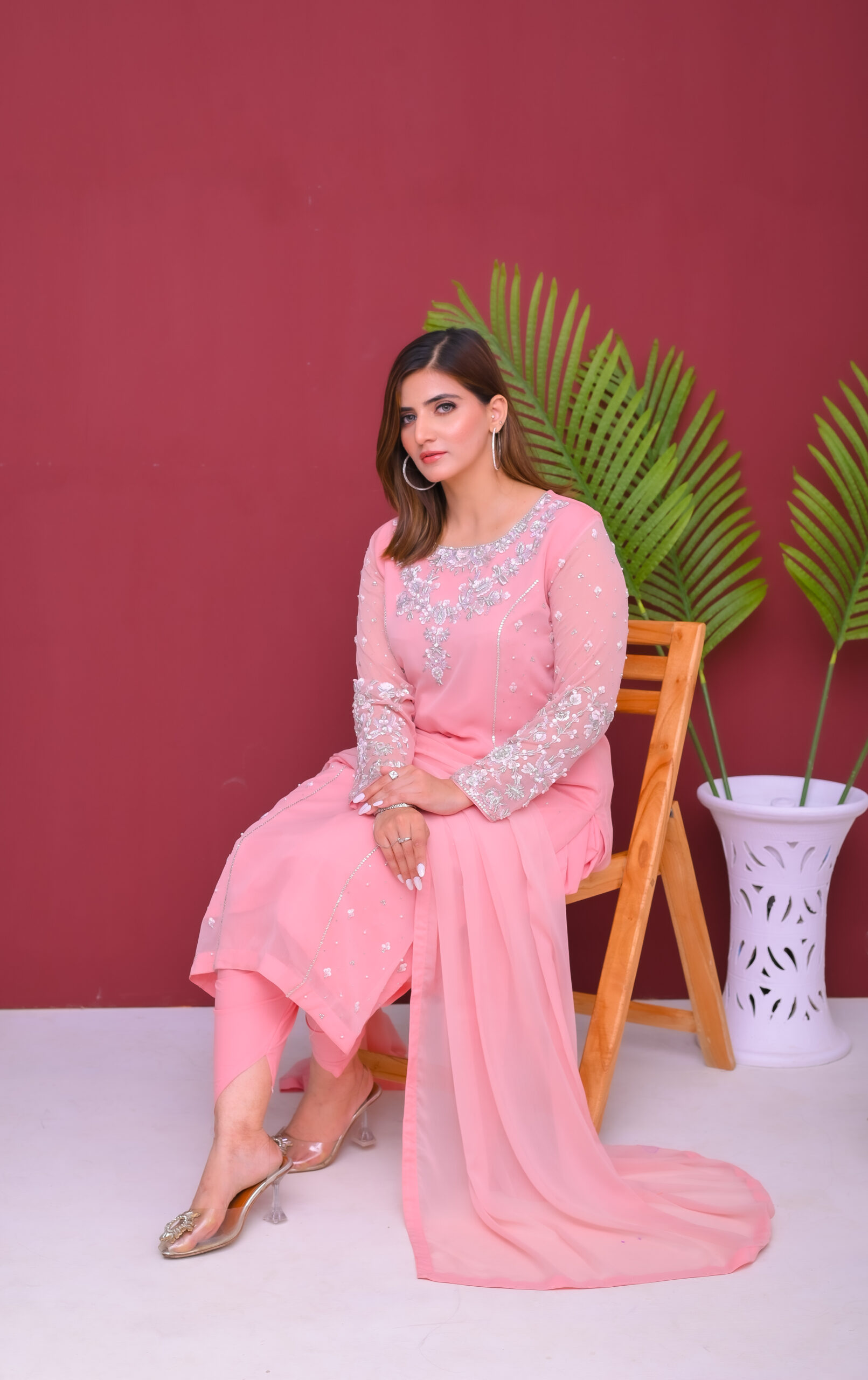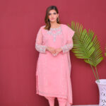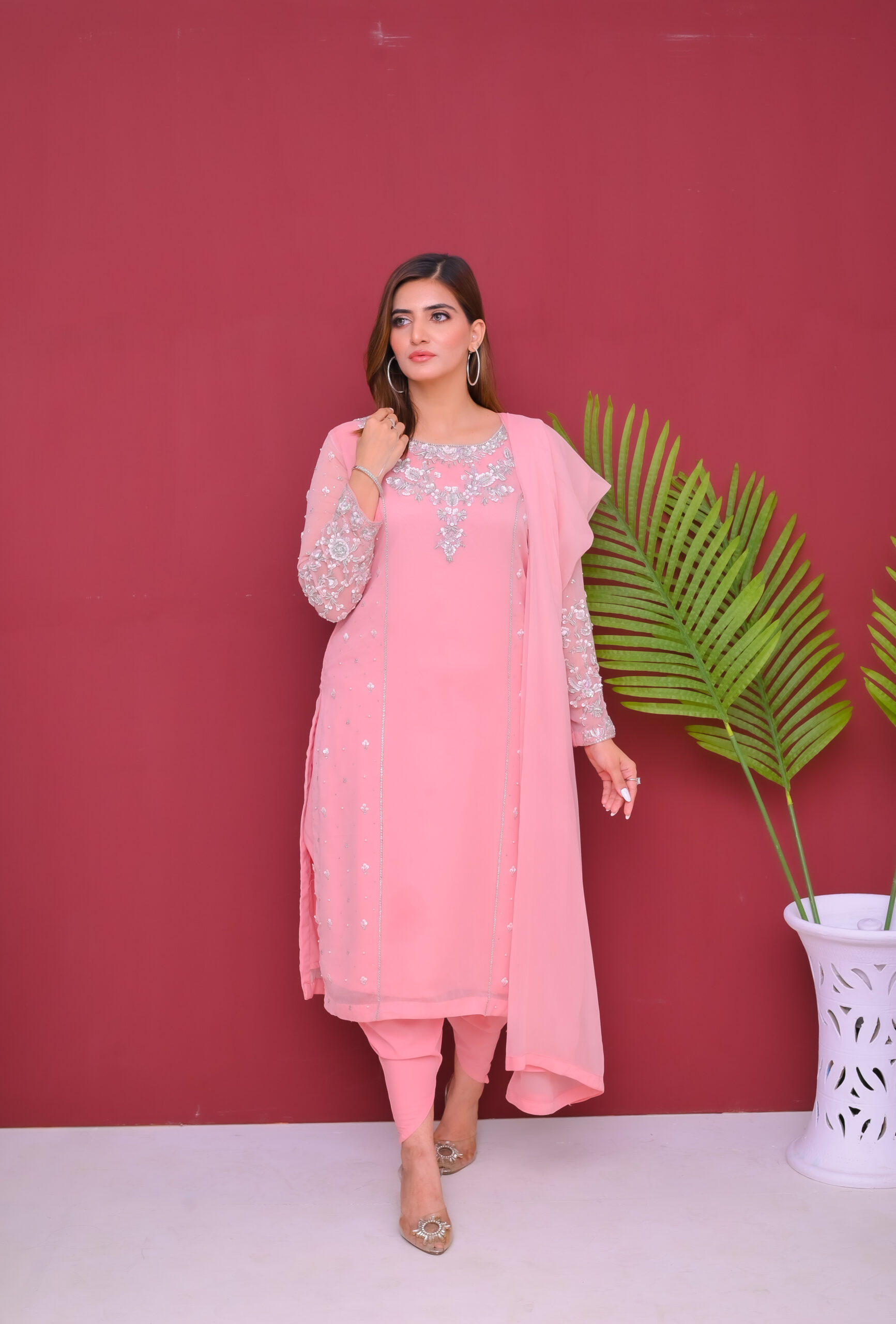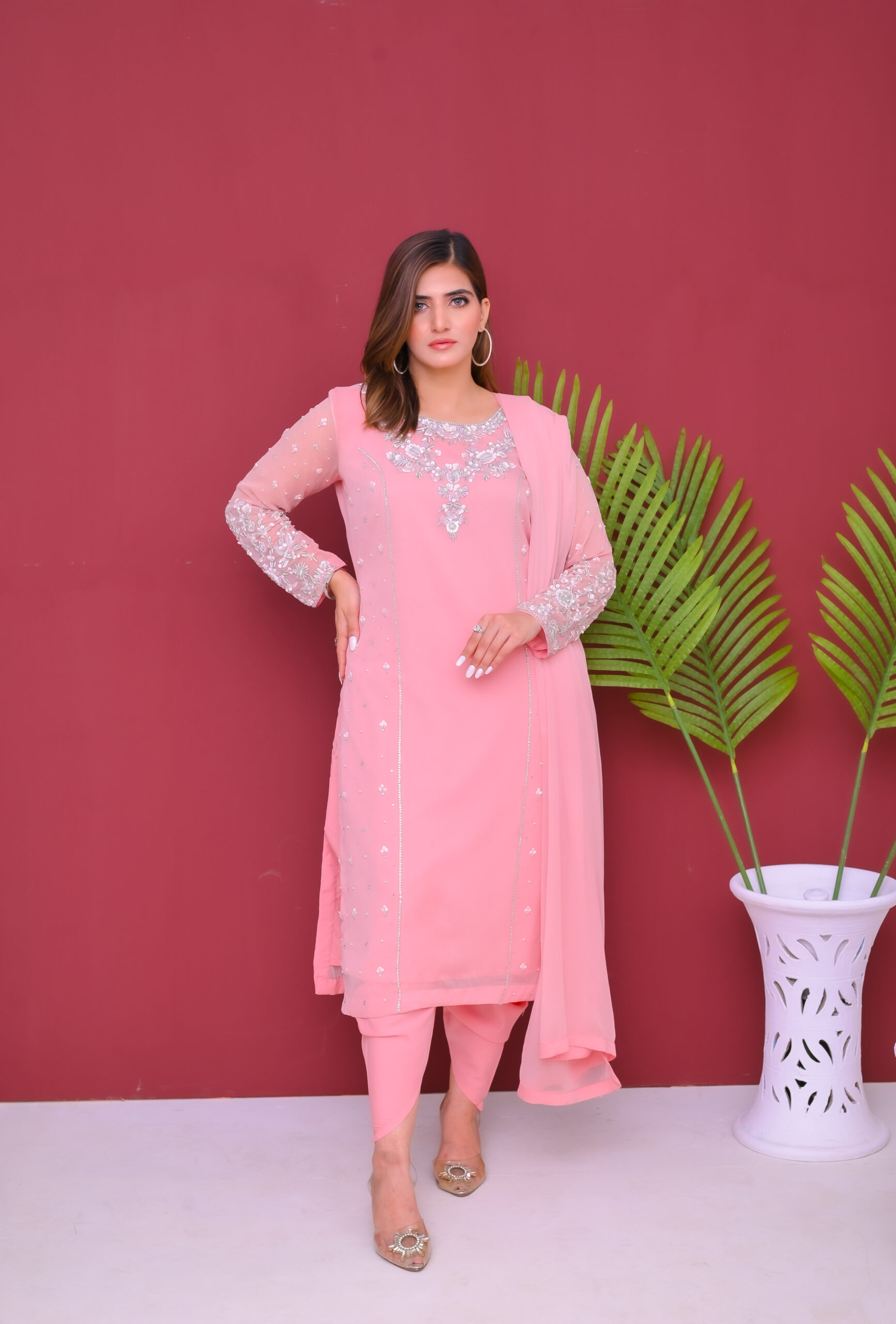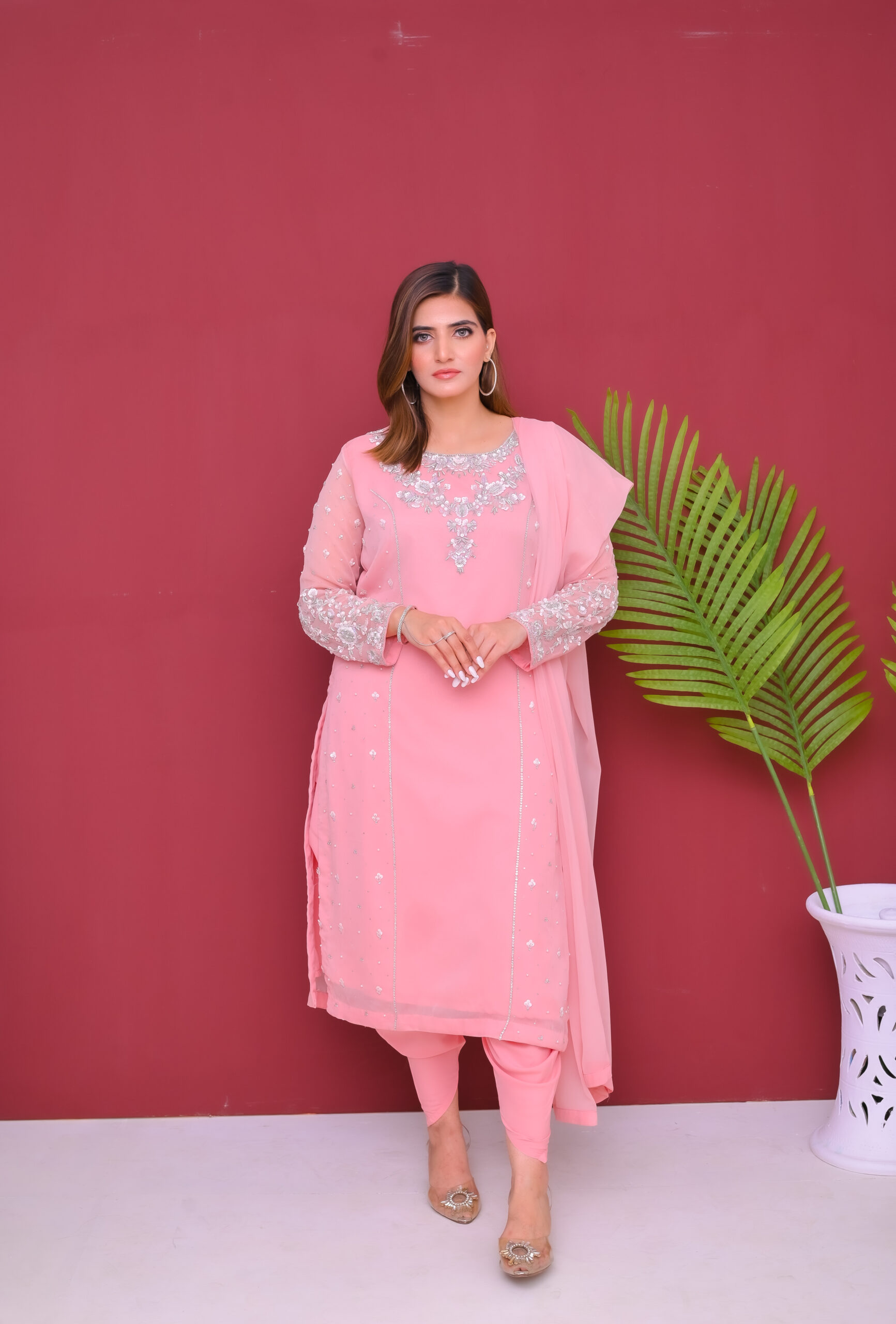 A delicate and elegant three-piece outfit crafted from semi-pure chiffon. Light, flowy, and beautifully designed, perfect for festive occasions and special gatherings