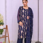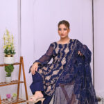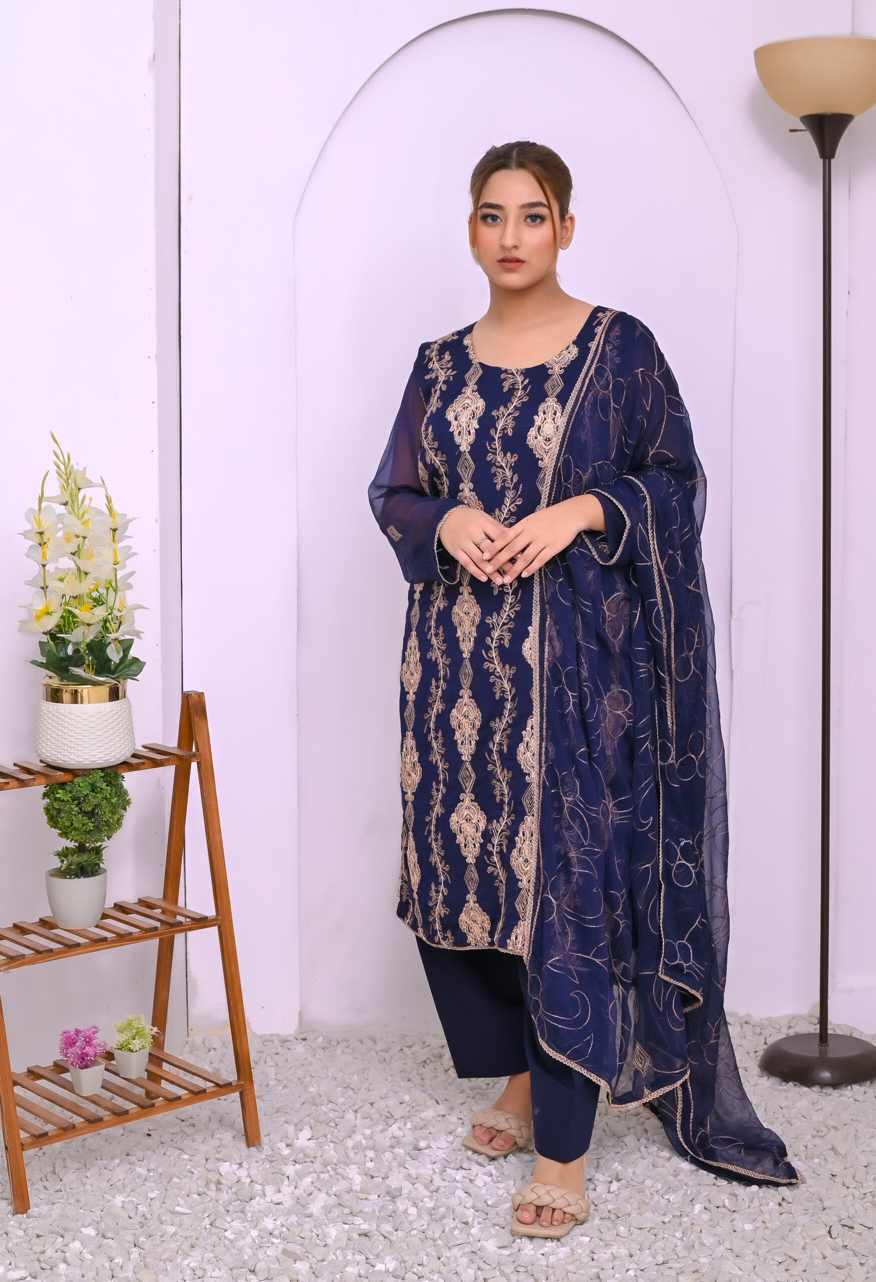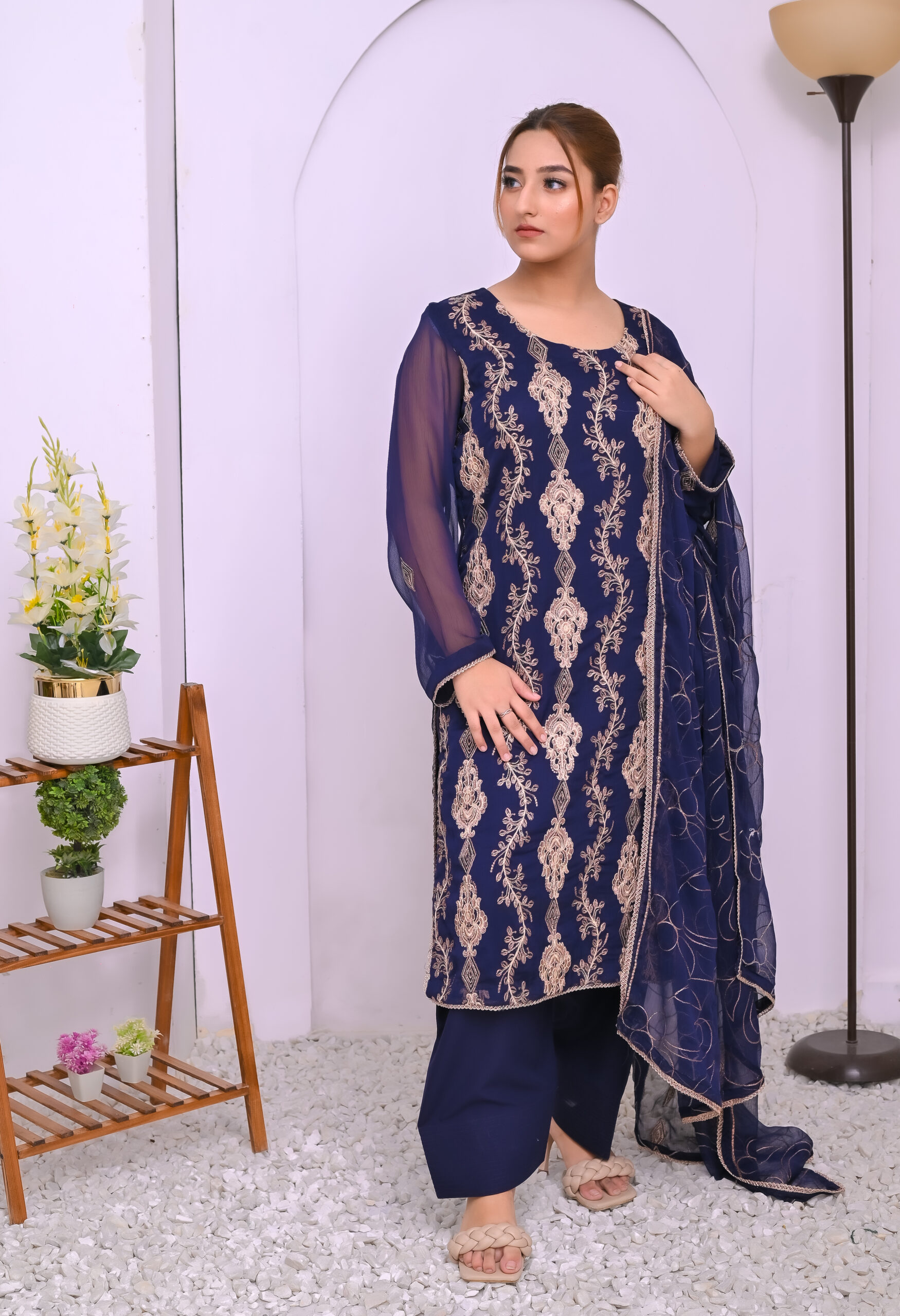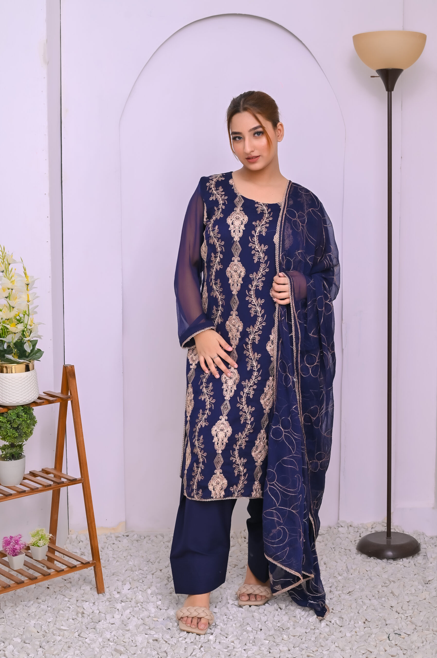 A stunning three-piece outfit in a rich festive blue shade, beautifully adorned with intricate karhai embroidery. Perfect for special occasions, combining elegance and traditional charm