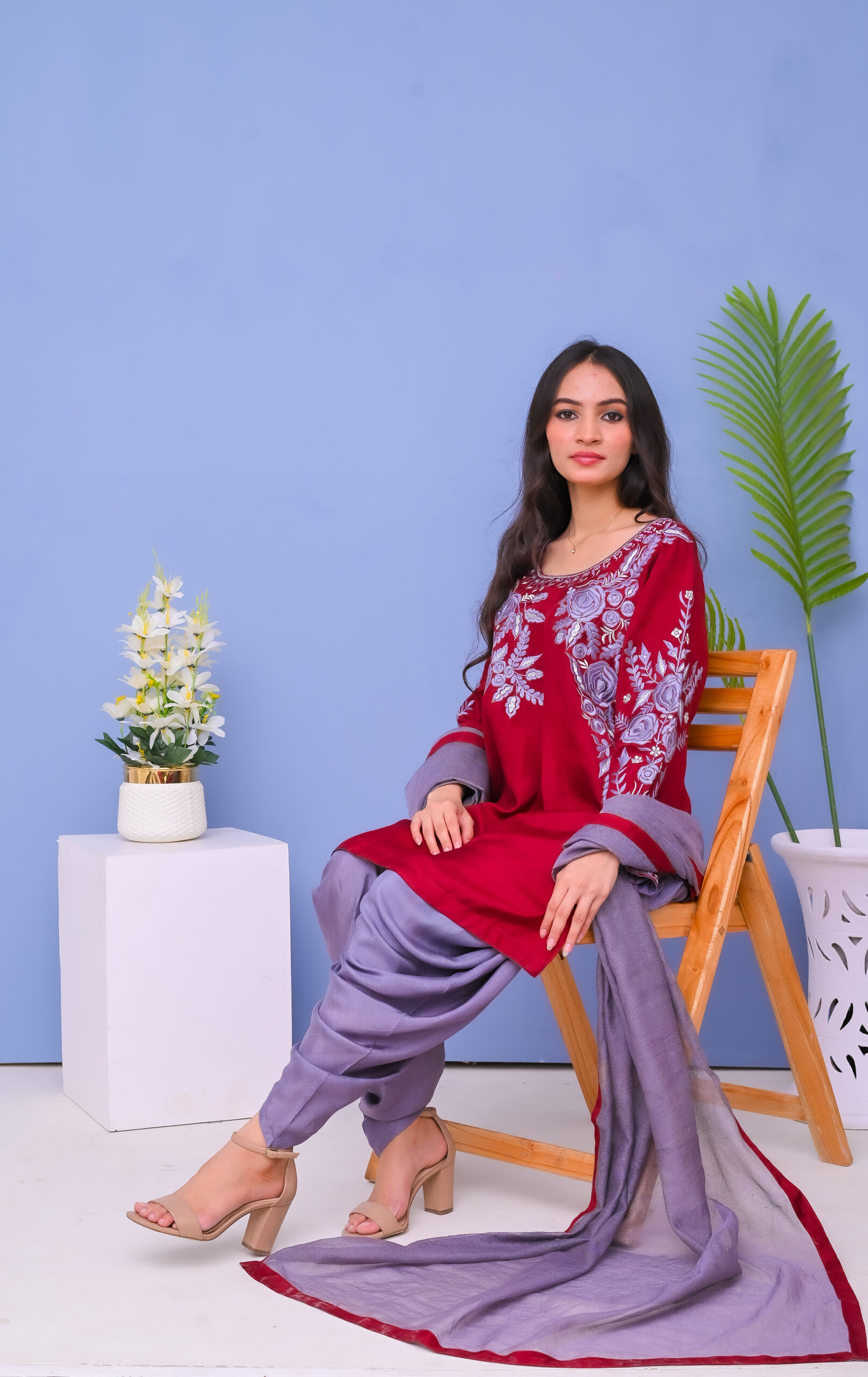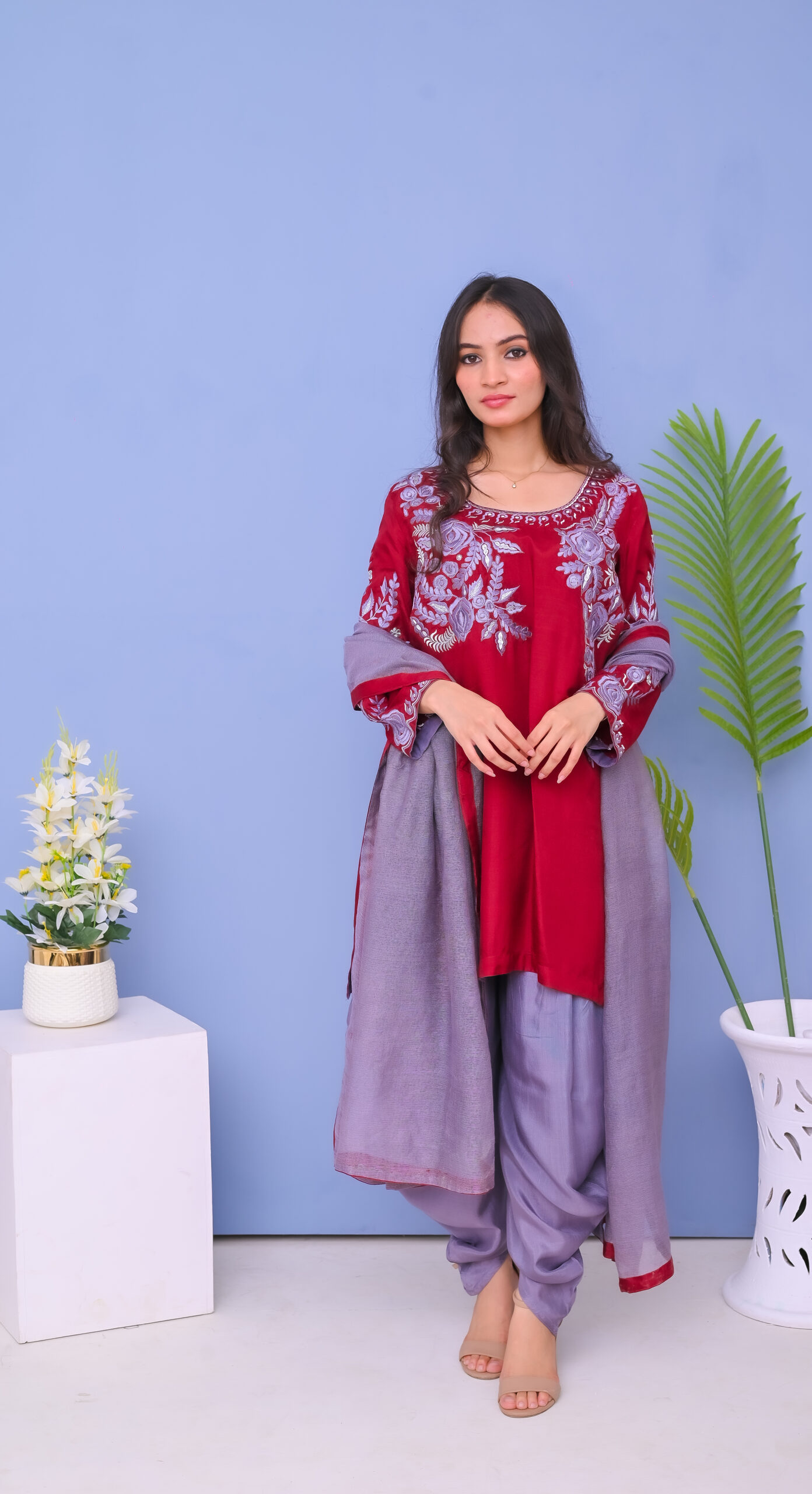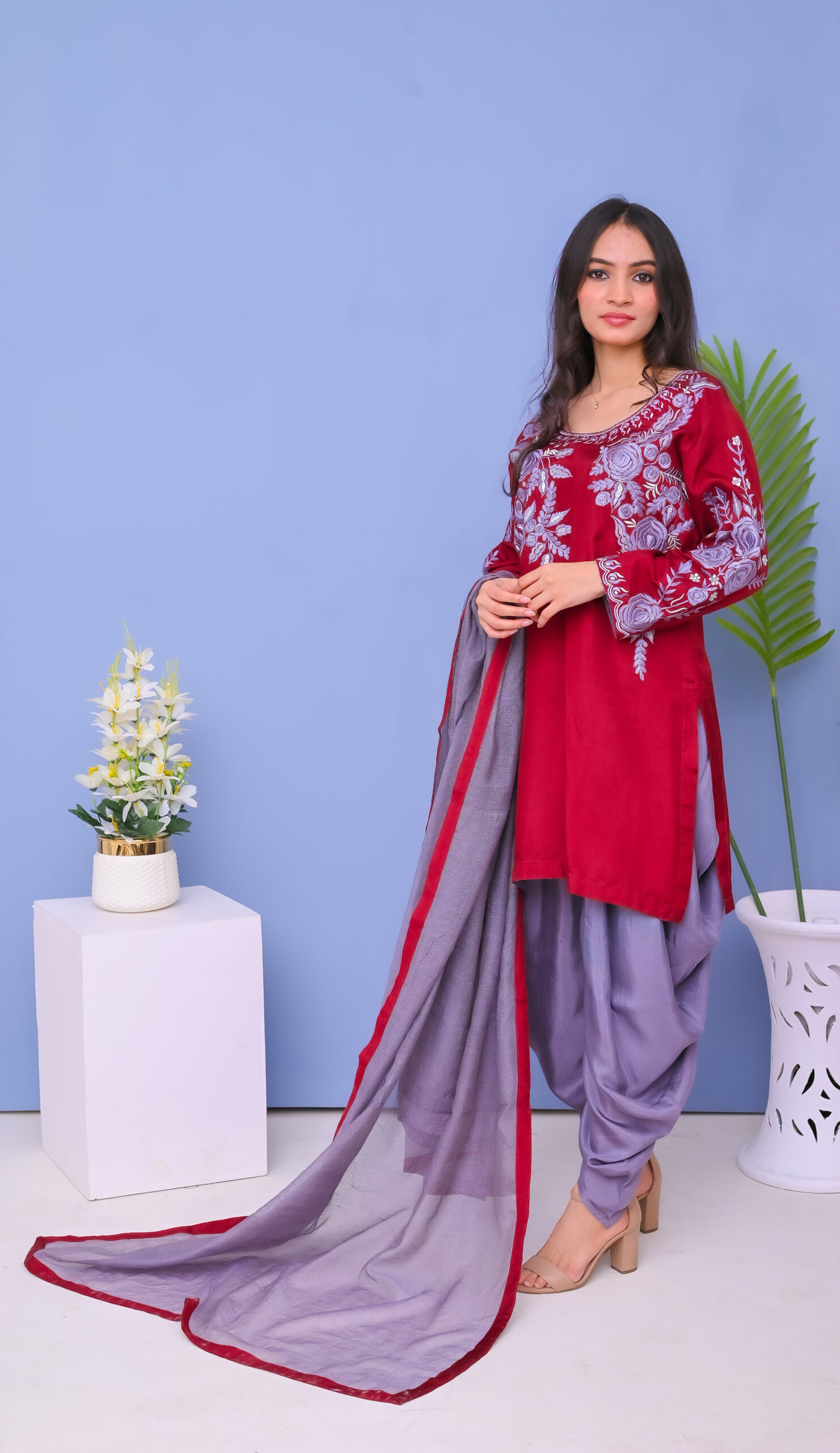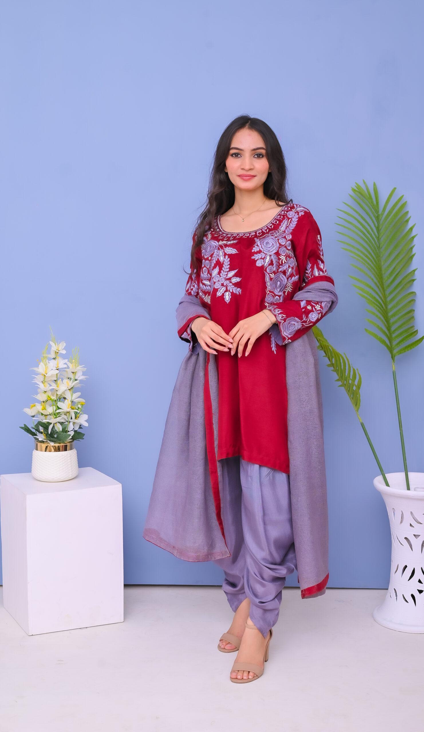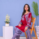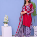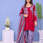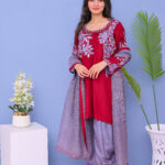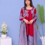 A stunning three-piece ensemble in red and grey tones, adorned with intricate machine embroidery. Perfect for festive and formal occasions, combining elegance with modern style
