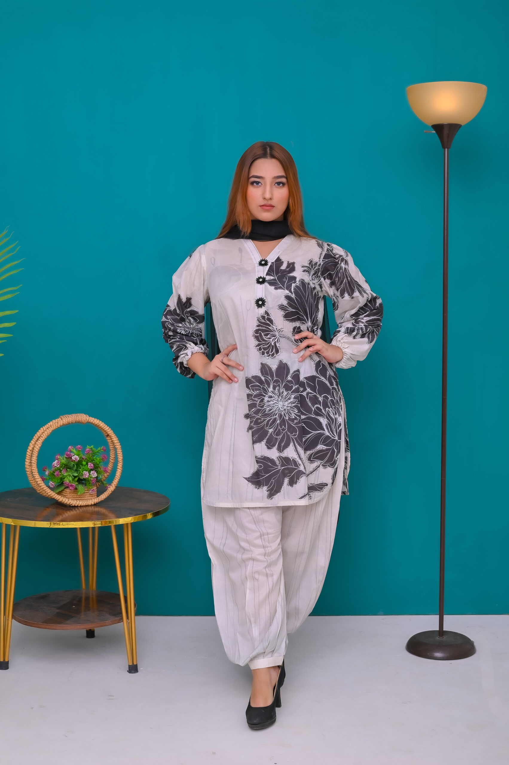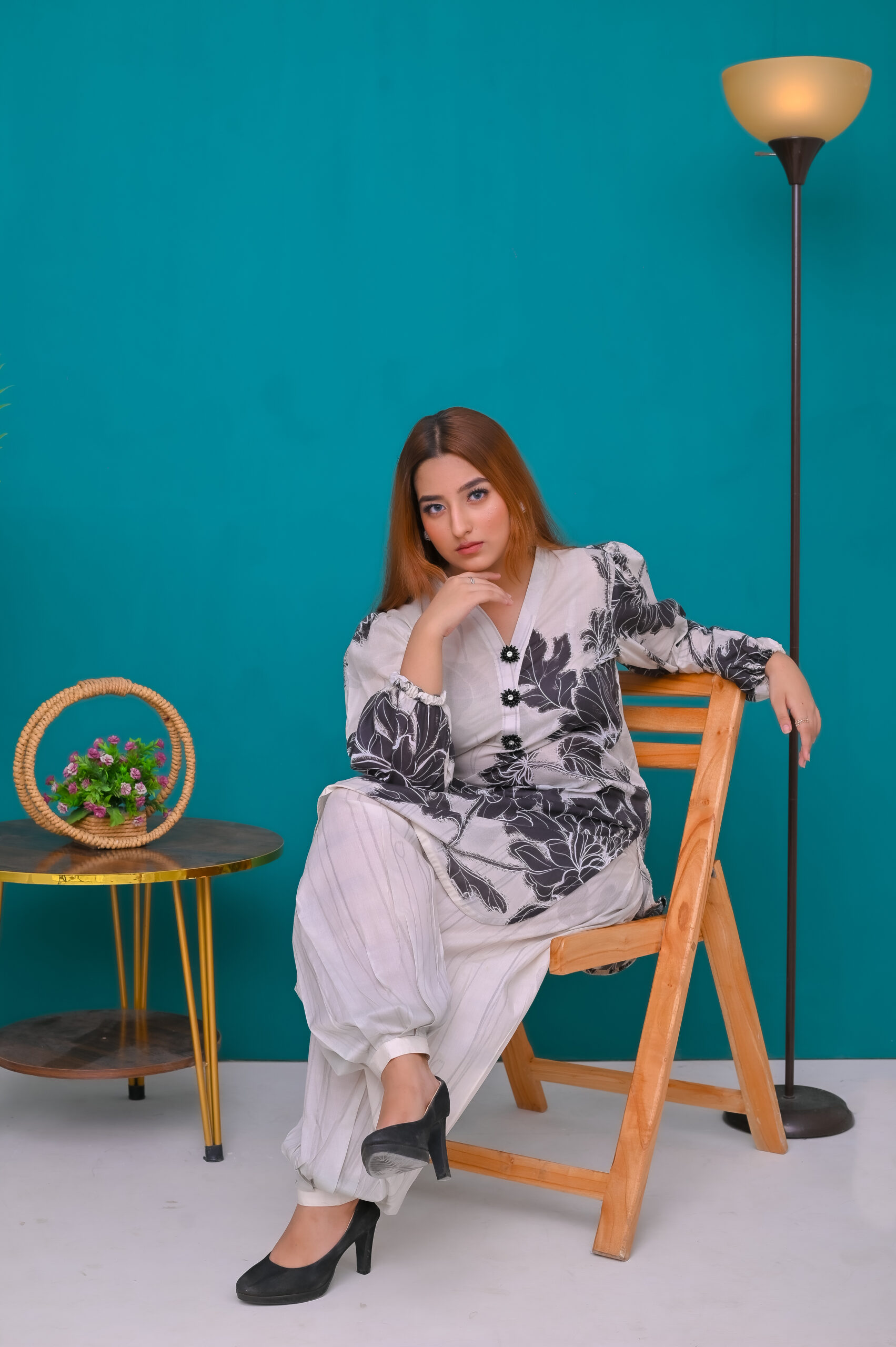 A chic and modern ensemble in timeless white and black hues, tailored from premium fabric for a sleek and comfortable fit. Ideal for casual gatherings or semi-formal events.